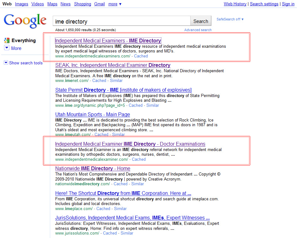 We achieve #1 search engine rankings via White Hat SEO - which produces results lasting longer than any other method. We are SEO (Search Engine Optimization) specialists. The Independent Medical Examiner IME Directory of medical file review consultants contains doctors, board certified physicians, psychologists, neuropsychologists, chiropractors, oral surgeons, orthodontists, nurses and other medical professionals and experts who perform Medical Expert Witness examinations - including:
